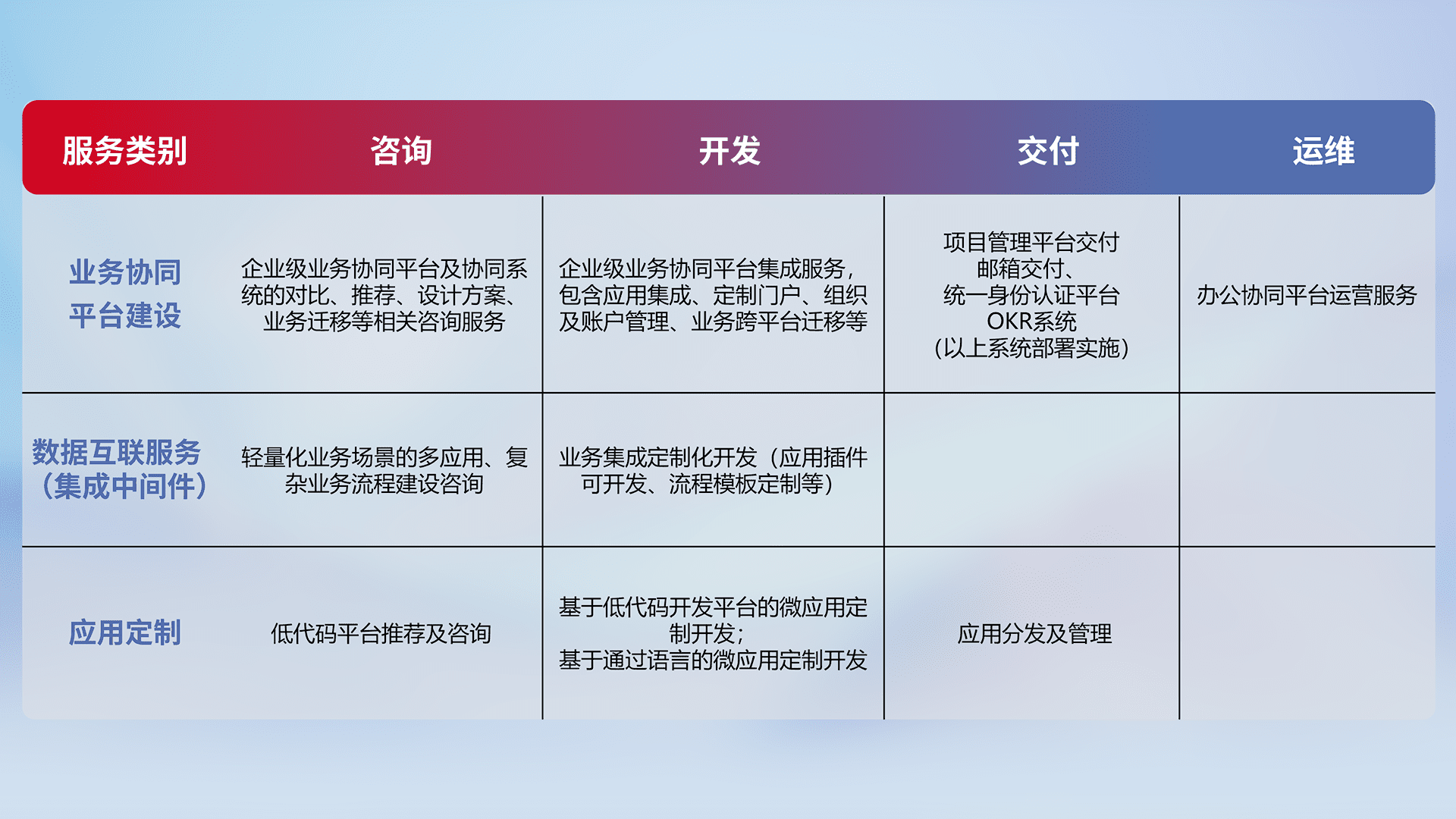 针对钉钉、、、企微、、IDaas等平台级产品提供产品的规划、、、方案、、交付、、定制化开发等服务,,实现如统一协同办公、、智能客户服务、、、、混合会议管理、、、、智能数据查询、、、、等业务场景,,,,实现数字化转型。。。。