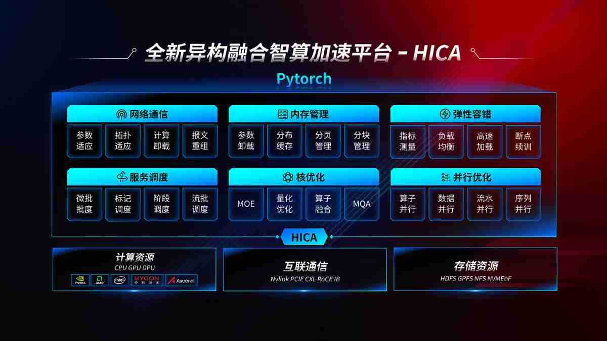 通过自研的服务层、、、中间适配层、、以及调度编排算法,,,,采用数据并行、、模型并行等多种并行方式,,,把并行计算任务进行有效的分解,,,使其分别由相应的软件栈和算力资源来承接。。当GPU资源变化,,,HICA可以实时动态调度计算子任务并调整模型拓扑和架构,,,以充分聚合各种算力资源。。。