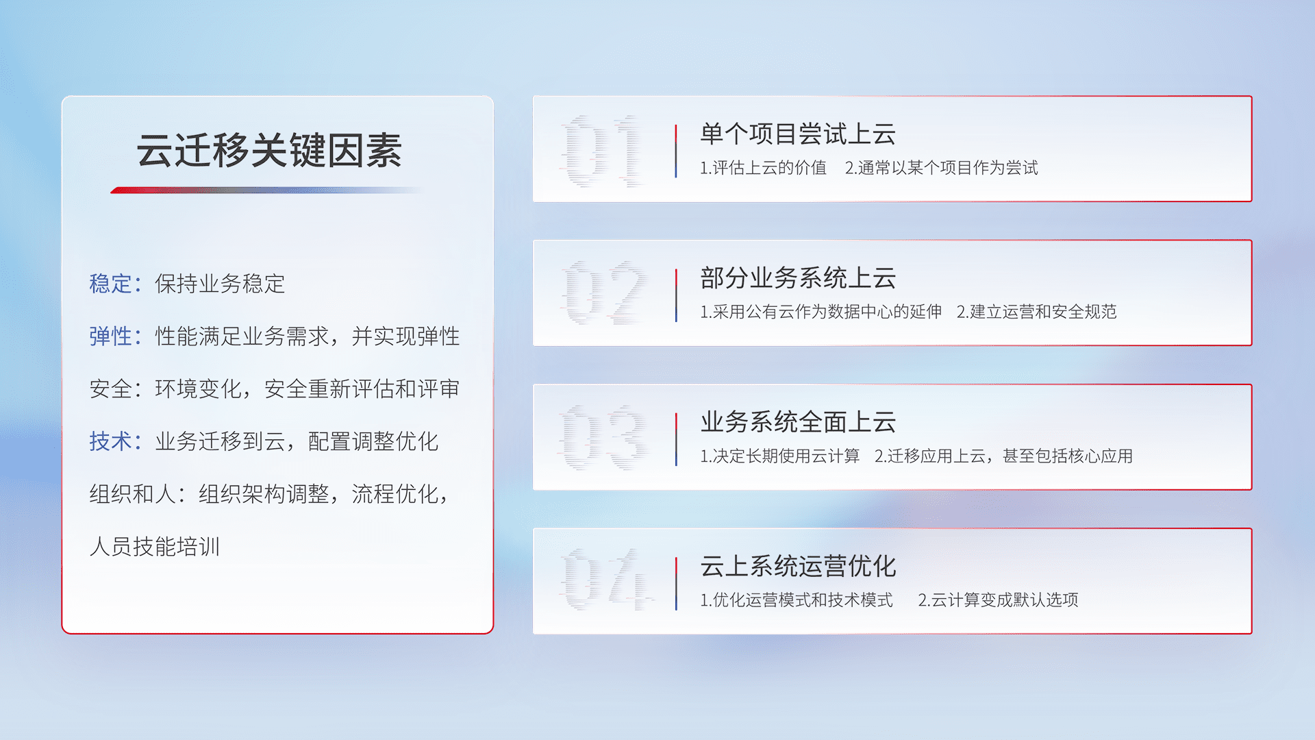 结合实际业务,,从规划设计、、、云平台选型、、、、云原生改造、、、数据迁移、、、集成交付,,,迁移全过程为客户识别最佳上云路径,,做好风险识别管理,,设计网络架构、、、、身份权限、、安全审计合规、、、、操作审计、、、、日志审计、、、监控告警策略、、、多站点容灾设计等,,对云上基础设施进行整体规划,,,提升IT治理水平,,,,以满足弹性、、高可用、、高性能的需求。。