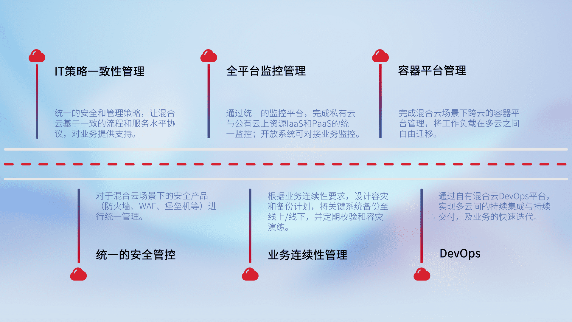 通过多云纳管,,以统一的资源数据模型把客户的云资源进行抽象和封装,,,,进而实现对多云资源的统一操作,,保障云资源管理的可靠性、、、稳定性与可用性。。。。量身定制化运维内容,,配置、、、开发运维、、、、补丁管理、、、备份、、、、监控、、、、认证和访问管理、、、审计和日常巡检等,,保障在用云过程中的可靠度,,,稳定度以及高可用率。。